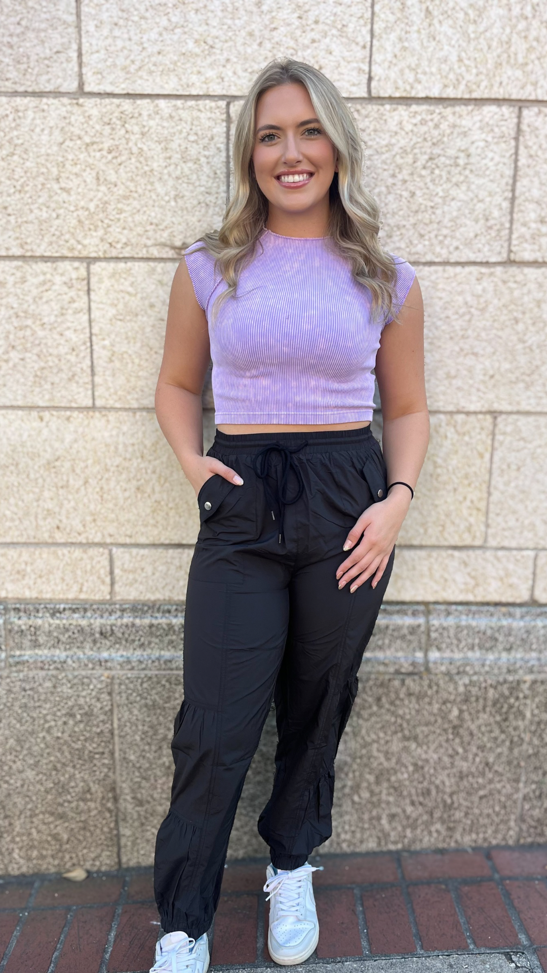 Lightweight cargo pants for your days on the go. Elastic waistband with drawstrings make it easy to slip on your new favorite pants. Side pockets for all your essentials. Pant legs come to ankles.